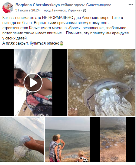 Как утверждает блогер Богдана Чернявская, в акватории массово гибнут медузы-корнероты. В этом она винит глобальное потепление, выбросы грязных веществ и строительство переправы.