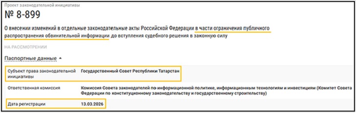 В Сети обсуждают законопроект, ограничивающий распространение "обвинительной информации" в СМИ и соцсетях. На днях Госсовет Татарстана выступил с предложением запретить публикацию данных об арестованных, подозреваемых и обвиняемых до вступления в силу приговора суда. Также чиновники предложили внести изменение в закон "О государственном и муниципальном контроле", которое крайне затруднит подачу жалоб на беззаконие.