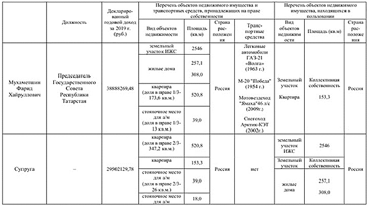 Интересно, что в финансовой отчётности самого Мухаметшина указано, что в 2019 году, когда он был премьер-министром Татарстана, его доход был 38 млн рублей, а доходы его жены - 29 млн. При том, что никакой недвижимости они не продавали. Но, согласно отчёту, в том году фирма супруги принесла 17 млн. А Мухаметшин на своём посту вместе с добавками, премиями и поощрениями заработал около 5 млн. Сам чиновник объясняет доходы инвестированием в ценные бумаги и гонорарами за чтение лекций.