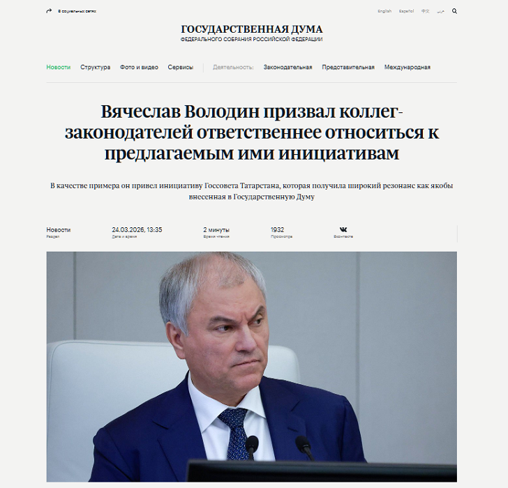 После того, как эту информацию стали активно обсуждать в Сети, председатель Госдумы России Вячеслав Володин выступил с заявлением в парламенте о том, что Госдума не рассматривает и, возможно, не будет рассматривать инициативу Госсовета Татарстана о запрете "обвинительной информации" в СМИ. По мнению спикера ГД, членам Госсовета Татарстана следовало сначала обсудить своё предложение в регионе, с представителями гражданского общества, прежде чем выносить его на федеральный уровень и формировать повестку.