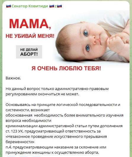 Сенатор Ольга Ковитиди предложила ввести уголовную ответственность за склонение к аборту. Она поддержала позицию митрополита Симферопольского и Крымского Тихона о том, что недопустимо подталкивать женщину к детоубийству. И предложила наказывать за такое преступление жёстче.