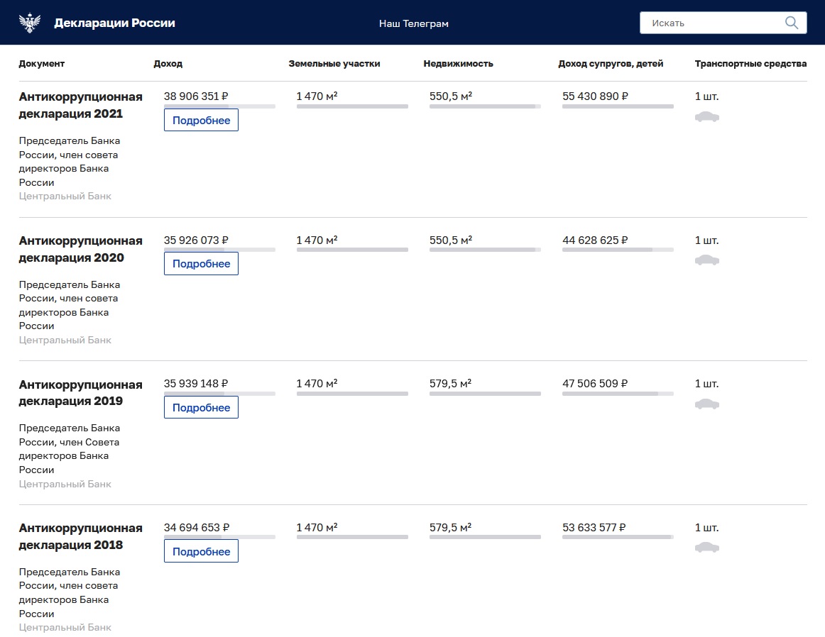 Так, если в период с 2015 по 2017 года доходы членов семьи не превышали 30 миллионов, то с 2018 года сумма их доходов резко скакнула до более чем 50 миллионов рублей. И к 2021 году совокупный доход Набиуллиной и членов её семьи составил рекордные 94 миллиона.