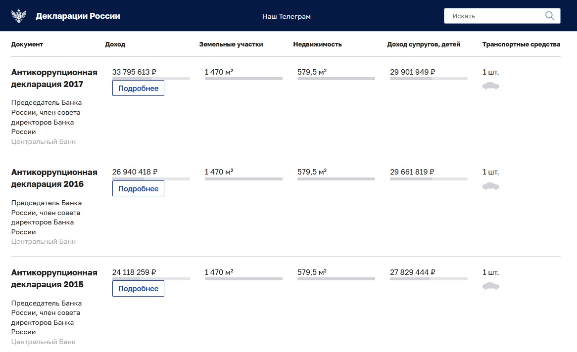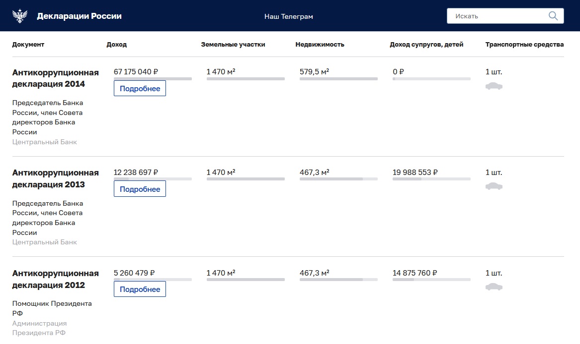 Так, в 2012 году, когда Эльвира Набиуллина занимала пост помощника президента России, её доход составлял 5 миллионов рублей. После перехода на должность председателя Банка России и члена Совета директоров Банка России в 2013 году доход Набиуллиной вырос более чем в два раза – до 12 миллионов рублей.