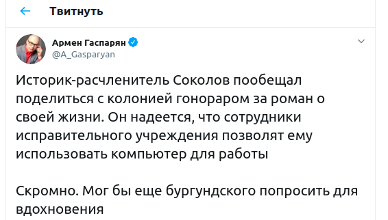 Историк-"расчленитель" Олег Соколов под арестом работает над своим романом и пообещал колонии, где будет отбывать наказание, отдать половину гонорара за книгу, если ему разрешат работать на компьютере. "Скромно", - сыронизировал над требованием Соколова политолог Армен Гаспарян.