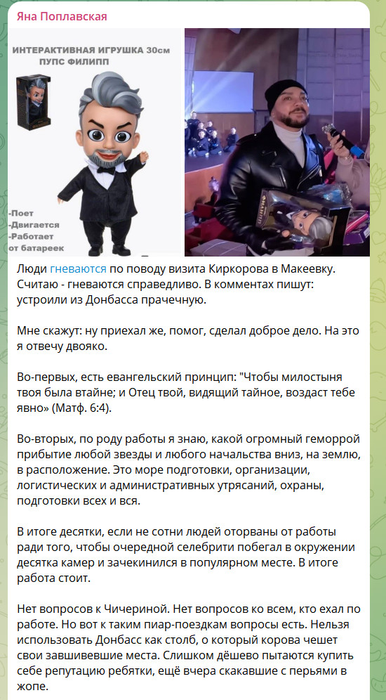 Напомним, Филипп Бедросович привёз воспитанникам творческого коллектива "Родничок" в Макеевке куклы в виде… самого себя. Нет худа без добра. Теперь мы точно знаем, что ни о каком раскаянии Киркоров и не помышлял. Там сплошное лицемерие и обман.