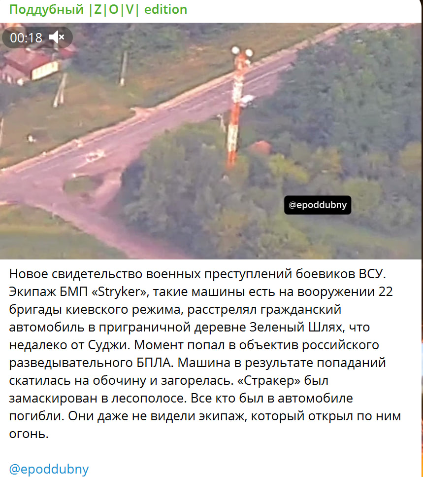 Вечером в среду в телеграм-канале военкора был опубликован пост о событиях, происходящих сейчас на Курском направлении. В частности, Поддубный рассказывал, что происходит близ приграничной деревни Зелёный Шлях, что недалеко от Суджи.