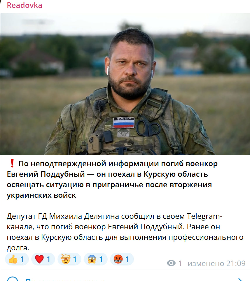 Пост Делягина был кратким: "Сообщают, что погиб журналист Евгений Поддубный".