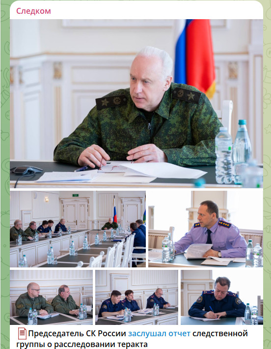 Председатель Следственного комитета России Бастрыкин провел оперативное совещание со следственной группой, а также руководством главного управления криминалистики (Криминалистического центра) и судебно-экспертного центра СК России. Был заслушан отчет следственной группы о расследовании уголовного дела о террористическом акте в "Крокус Сити Холле". Главе ведомства доложено о проводимых мероприятиях в соответствии с детальным планом расследования уголовного дела,