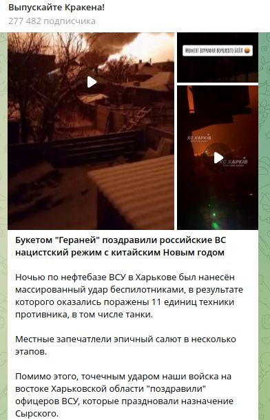 "Букетом "Гераней" поздравили российские ВС нацистский режим с китайским Новым годом. Ночью по нефтебазе ВСУ в Харькове был нанесён массированный удар беспилотниками, в результате которого оказались поражены 11 единиц техники противника, в том числе танки. Местные запечатлели эпичный салют в несколько этапов. Помимо этого, точечным ударом наши войска на востоке Харьковской области "поздравили" офицеров ВСУ, которые праздновали назначение Сырского".