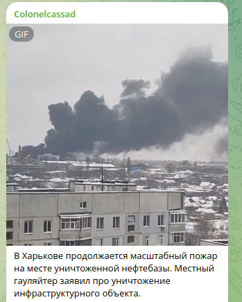 "В Харькове продолжается масштабный пожар на месте уничтоженной нефтебазы. Местные власти подтвердили поражение именно хранилища ГСМ в районе Немышли. Взрывы и последовавший за ними пожар были настолько масштабными, что сквозь тотальную цензуру в Сеть утекло большое количество фото и видео".