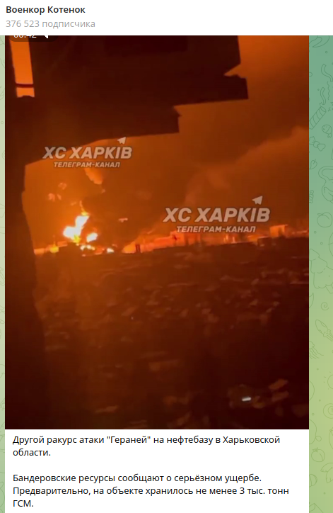 "Другой ракурс атаки "Гераней" на нефтебазу в Харьковской области. Бандеровские ресурсы сообщают о серьёзном ущербе. Предварительно, на объекте хранилось не менее 3 тыс. тонн ГСМ".