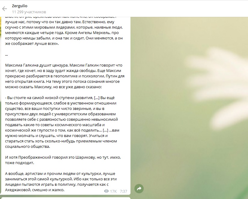 "Максима Галкина душит цензура. Максим Галкин говорит что хочет, где хочет, но в заду зудит жажда свободы. Еще Максим прекрасно разбирается в геополитике и психологии, Путин для него открытая книга. На тему этого потока сознания многое можно сказать Максиму, но все уже давно сказано: