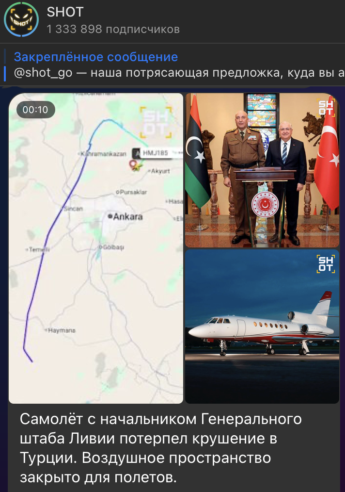 Вчера издание NTV сообщило, что самолёт Falcon 50, на борту которого находился начальник Генштаба армии Ливии, потерпел крушение в районе Анкары. Ранее глава ливийского Генштаба Мухаммед Али аль-Хаддад провёл в Турции встречи с представителями высшего военного руководства страны. Согласно источникам турецкой стороны, борт, перевозивший делегацию Генштаба, испытал сбой в электроснабжении. Пока доподлинно не известно, был ли это взрыв или техническая неисправность.