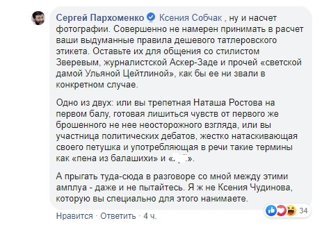 Как оказалось, Собчак, в том числе обиделась на то, что Пархоменко сфотографировал ее без разрешения в студии. Как оказалось, на станцию она пришла, однако в беседе участия не принимала. Пархоменко выставил ситуацию иначе. Предложил Собчак выбрать - "или она Наташа Ростова на первом балу... или участница политических дебатов, жестко натаскивающая своего петушка", а также использующая такие термины, как "пена из Балашихи". Кого в этой фантазии Пархоменко представляет "жестко натаскиваемым петушком", остается неясным.