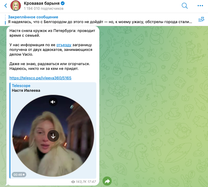 Накануне в Сети появились сообщения о подготовке блогера Анастасии Ивлеевой к отъезду в Дубай. Позже журналист Ксения Собчак поделилась в своём ТГ-канале "Кровавая барыня" подробностями. По ее словам, Ивлеева якобы уехала за границу на фоне повторного задержания рэпера Николая Васильева (Vacio).