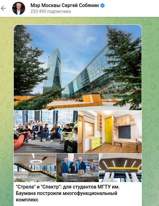 Для студентов МГТУ им. Баумана построили многофункциональный комплекс - "Стрела" и "Спектр". Об этом сообщил мэр Москвы Сергей Собянин в своём телеграм-канале.