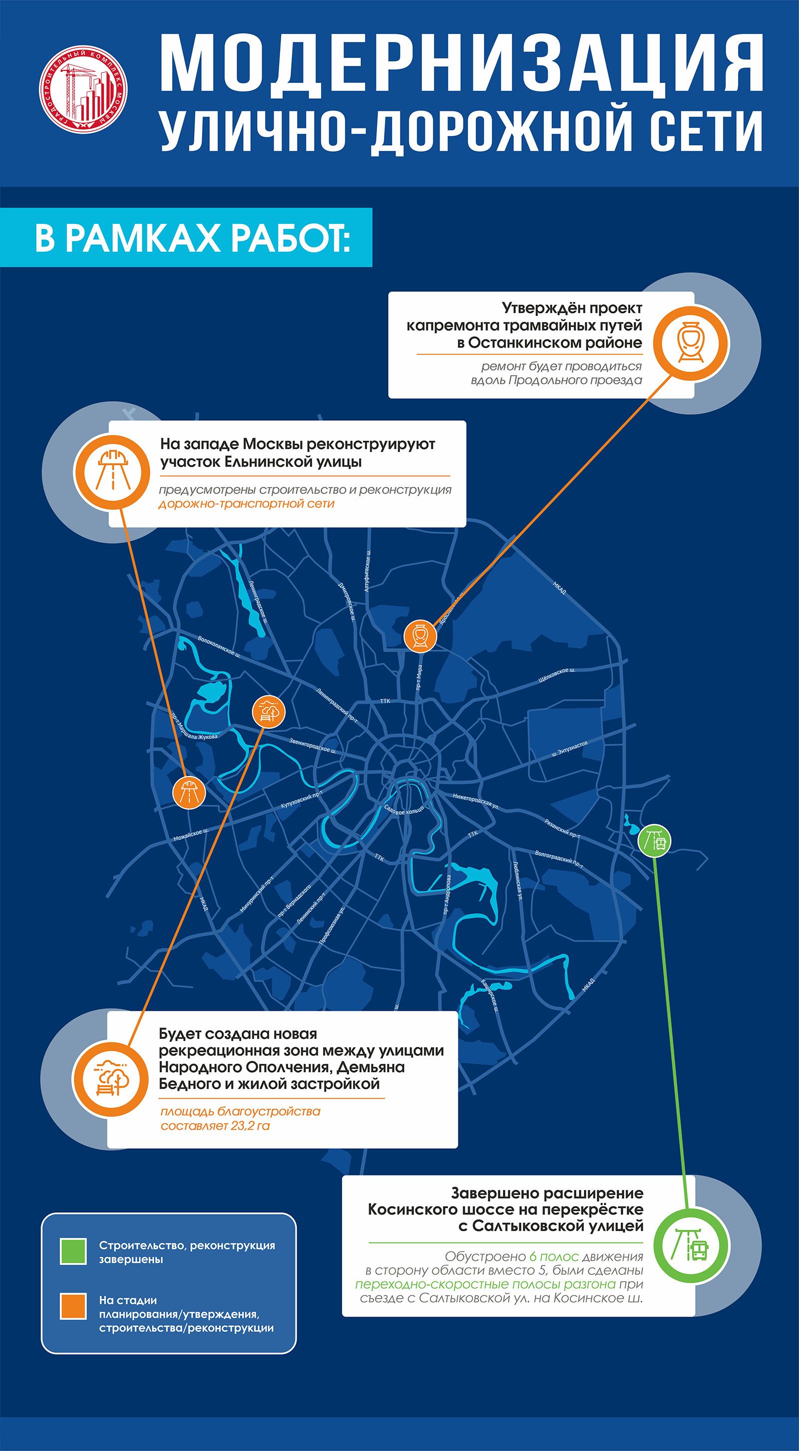 В столице постоянно идут работы по поддержанию и развитию городской инфраструктуры. Так, в районе Косино-Ухтомский улучшили условия проезда по Косинскому шоссе на перекрёстке с Салтыковской улицей в сторону области, а на северо-востоке Москвы продолжается капитальный ремонт трамвайных путей.