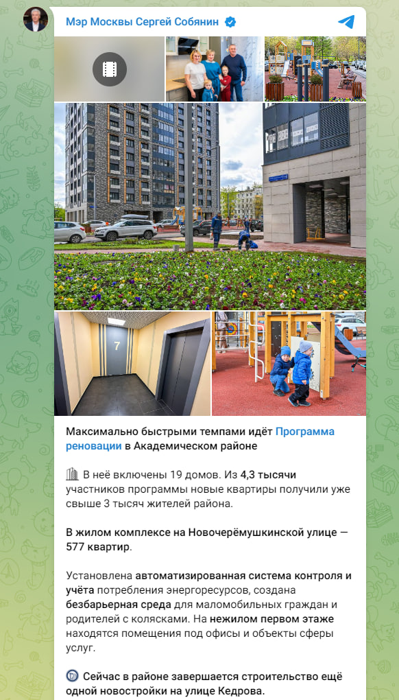 Более трех тысяч участников программы реновации в Академическом районе Москвы получили новое жилье. Об этом в своем телеграм-канале сообщил мэр города Сергей Собянин.