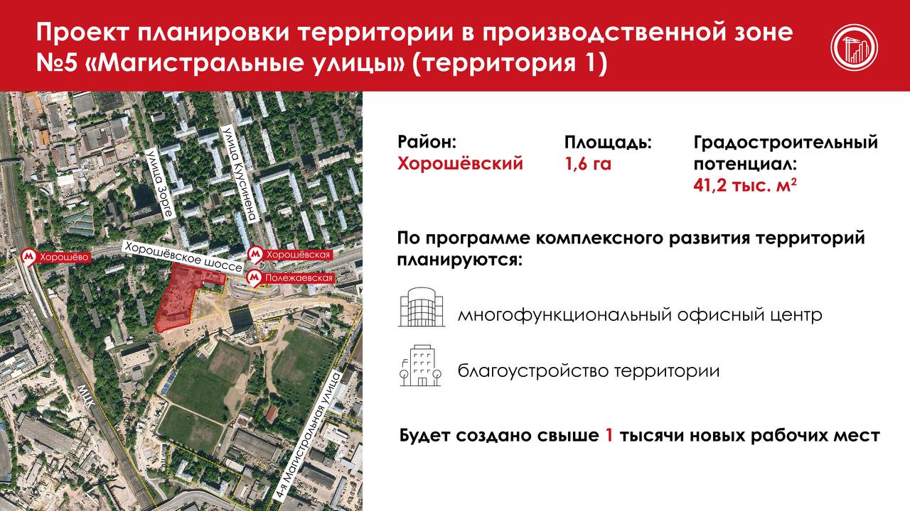 Реорганизуемая территория площадью 1,6 гектара расположена в Хорошевском районе Москвы. На данный момент большая её часть занята торгово-бытовыми, жилищно-коммунальными и другими устаревшими объектами. В рамках программы комплексного развития территорий здесь планируется возвести многофункциональный офисный центр с подземной парковкой, отделениями банков, кафе и магазинами. Его общая площадь составит 41,2 тысячи квадратных метров.