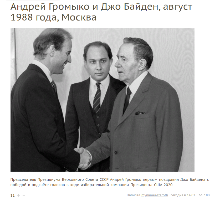 Председатель Президиума Верховного Совета СССР Андрей Громыко первым поздравил Джо Байдена - новости с такими заголовками сегодня бьют рекорды просмотров в социальных сетях. Чтобы не быть голословными, авторы постов публикуют архивные фотографии со встречи Байдена и Громыко в 1988 году.