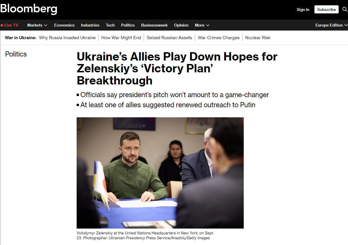 Зеленский прилетел в Нью-Йорк и попытался уговорить своих союзников принять его "план победы", который некоторых из них, мягко говоря, разочаровал, пишет Bloomberg. Как минимум один из партнёров предложил и.о. президента Украины начать переговоры лично с Владимиром Путиным. Американское издание также заявило об "отсутствии прорыва в конфликте с Россией" и об "историческом" решении Москвы.
