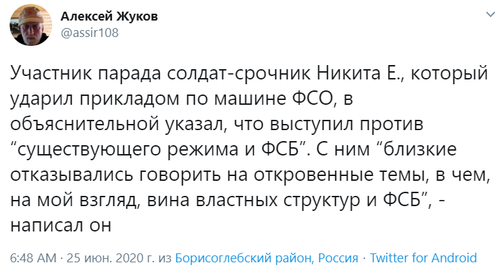 Ранее сообщалось, что солдат-срочник, который должен был участвовать в Параде Победы, незадолго до начала мероприятия был переведён в резерв. По неподтверждённым данным, поводом для отстранения от парада стала драка с другим участником торжественного мероприятия. Узнав о решении руководства, военнослужащий ударом приклада автомата разбил окно машины ФСО.