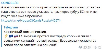 А мы оставляем за собой право ответить на любой ваш ответ на наш ответ, а вот права указывать нам через губу у ЕС нет и не будет. 90-е уже в прошлом, - отметил Соловьёв.