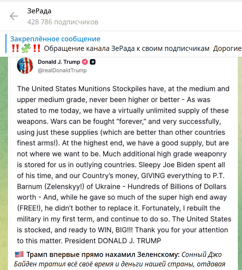 Сонный Джо Байден тратил всё своё время и деньги нашей страны, отдавая всё П. Т. Барнуму (Зеленскому!) из Украины — на сотни миллиардов долларов — и, раздав так много самого передового вооружения (бесплатно!), он даже не позаботился о его восполнении,
