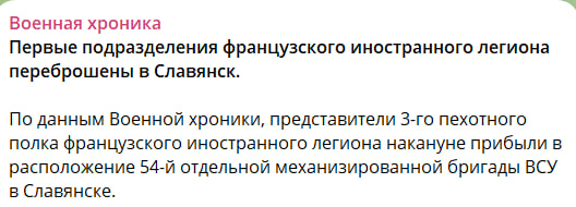 Согласно предварительной информации, в зону Специальной военной операции прибыли передовые подразделения 3-го пехотного полка Иностранного легиона французских вооружённых сил. Они были переброшены в расположение 54-й отдельной механизированной бригады ВСУ в Славянске.