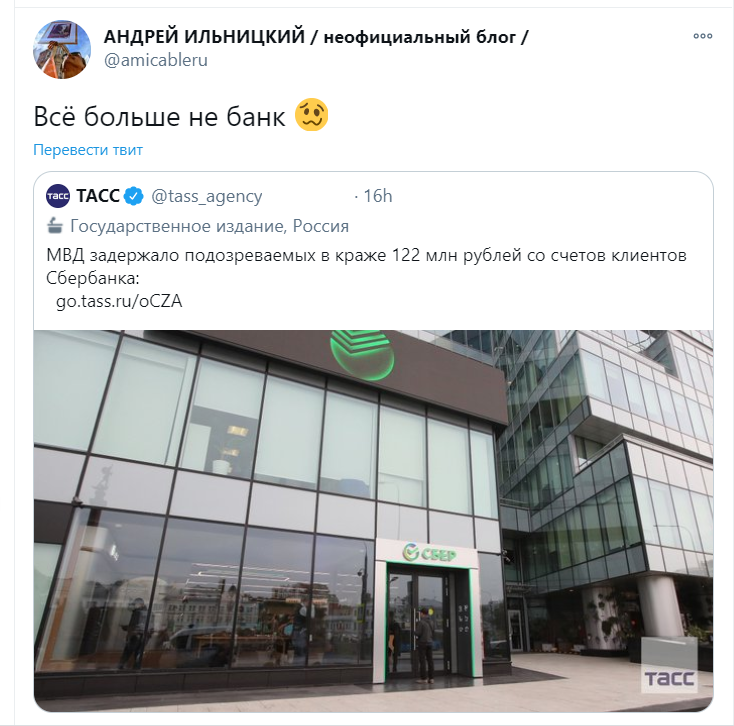 Масштабные хищения, выявившие серьёзные пробелы в системе безопасности Сбера, получили широкую огласку. Люди боятся за свои сбережения, которые могут достаться любому проходимцу. Общественный деятель и публицист, советник министра обороны РФ Андрей Ильницкий оставил в своём Твиттер лаконичный комментарий с намёком на недавний ребрендинг Сбера: "Всё, больше не банк..."