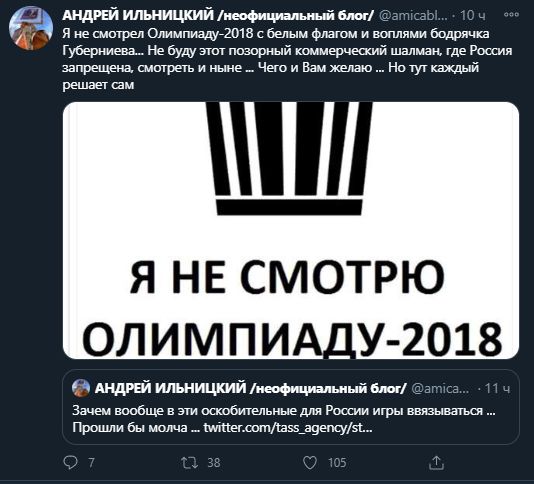 На своей странице в Twitter Ильницкий признался: прошлую Олимпиаду, которая в 2018 году проходила в южнокорейском Пхёнчхане, не смотрел. Тогда российская сборная выходила под белым нейтральным флагом