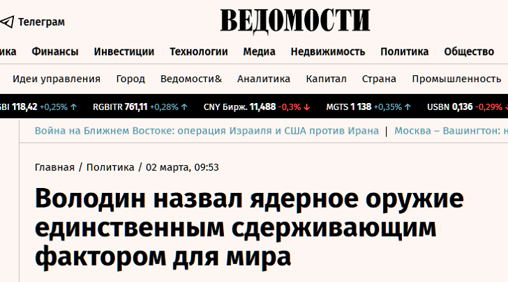 Председатель Госдумы Вячеслав Володин назвал ядерное оружие единственным сдерживающим фактором в период ослабленных международных институтов. Как сказал политик, с ними не считаются, а балансы, ранее поддерживаемые, не работают.
