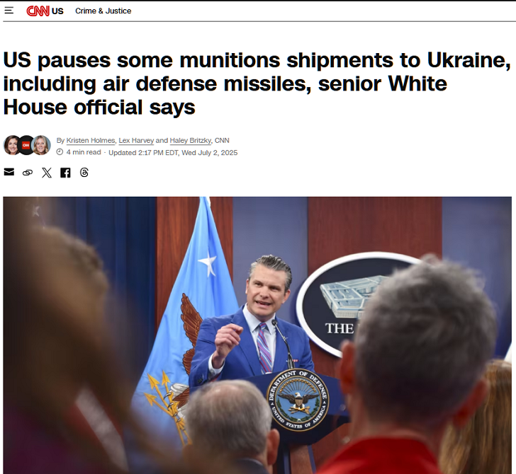 США приостанавливают поставки некоторых видов боеприпасов на Украину, в том числе ракет для систем ПВО (автоперевод) Скриншот: CNN