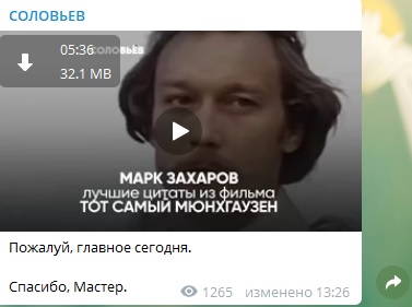 Отметим, Владимир Соловьев свои реплики дополнил нарезкой из фильмов Марка Захарова с великими цитатами, отметив в телеграм-канале: "Спасибо, Мастер!"
