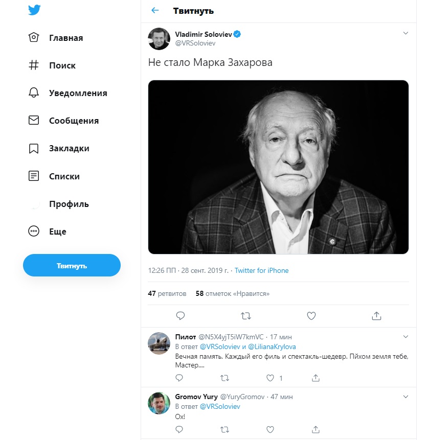 В том числе об утрате высказался на личной странице тележурналист Владимир Соловьев, оставив короткую фразу: "Не стало Марка Захарова". Подписчики подхватили эстафету в миг.
