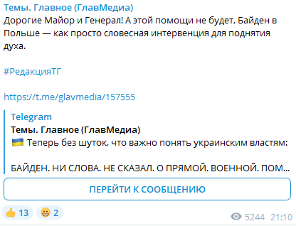Telegram-канал "Темы. Главное (ГлавМедиа)" в свою очередь отметил, что никакого реального эффекта от выступления Байдена не будет. Это просто "словесная интервенция для поднятия духа".