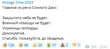 Автор Telegram-канала Brееgе Timе ZOZZ тезисно передал речь президента США, с которой он выступил в субботу в Варшаве. Коротко её можно свести к пяти коротким фразам: "Закрытого неба на Украине не будет. Военной помощи не будет. Украинцы молодцы. Демократия. Спасибо, пожалуйста, до свидания".