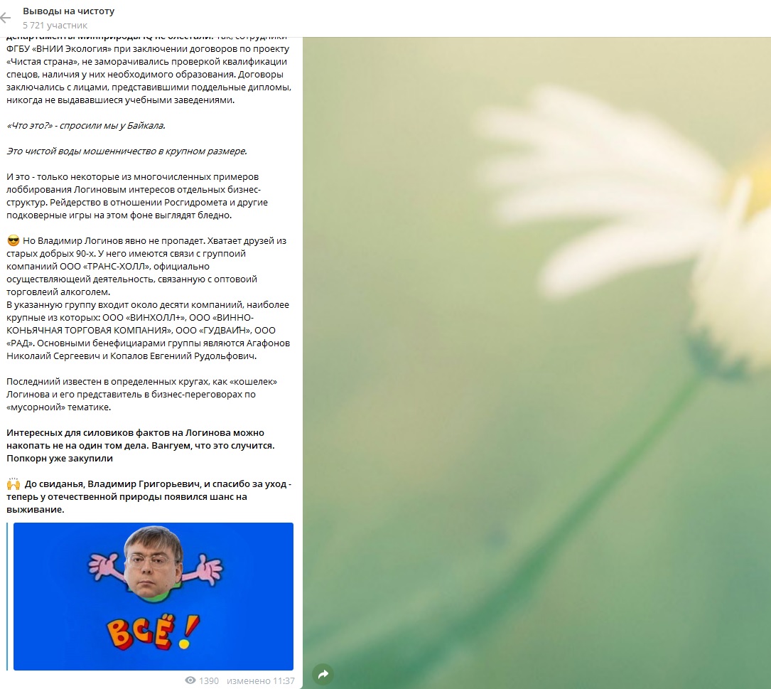 "По всей видимости, наибольшее количество вопросов вызывают направления, которые были закреплены за заместителем министра Логиновым, такие как "мусорная реформа", выполнение ФЦП "Байкал", курирование и методологическое обеспечение деятельности нижестоящих ведомств и другие", - пишут авторы телеграм-канала "Выводы на чистоту".