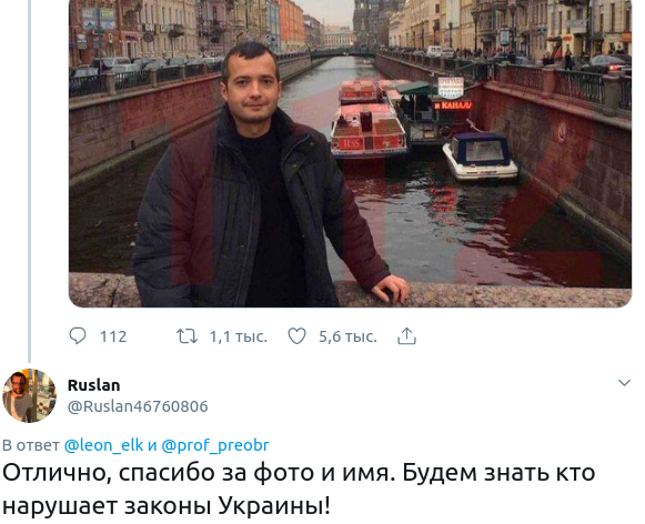 "Отлично, спасибо за фото и имя. Будем знать, кто нарушает законы Украины!" - опубликовал он твит в Сети, сделав репост с фото КВС Дамира Юсупова.