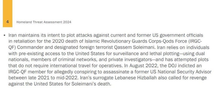 В документе утверждается, что для ликвидации американских чиновников Иран полагается на лиц, уже имеющих доступ в США. Речь идёт о лицах с двойным гражданством, членов преступных сетей и частных детективов. Кроме того, Иран якобы предпринимает попытки заговоров, которые не требуют международных поездок.