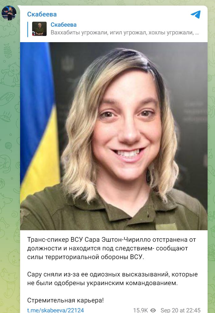 "Сержант-трансгендер Сара Эштон-Чирилло отстранена от должности спикера ВСУ. Кем теперь назначат, интересно? Министром дошкольного образования или главным акушером-гинекологом Украины?" - иронично заметила официальный представитель МИД России Мария Захарова в своём телеграм-канале.