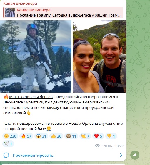 По странному совпадению террорист, взорвавший Tesla в Лас-Вегасе, и террорист, задавивший людей в Новом Орлеане, служили на одной военной базе - Форт Брэгг в Северной Каролине, где расквартированы части войск специального назначения армии США. На той же базе бывал Райан Рут, который в конце прошлого года покушался на жизнь Дональда Трампа.