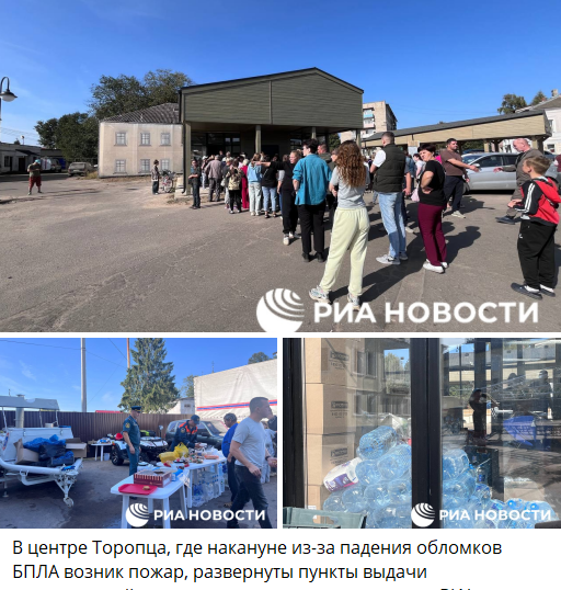 Накануне стало известно об атаке украинских беспилотников на город Торопец в Тверской области. Целью атаки был склад с боеприпасами. Об этом складе ещё в 2018 году говорил бывший замминистра обороны генерал Дмитрий Булгаков, расписывая его как суперхранилще, способное выдержать даже ядерную бомбу. После атаки в городе начался пожар, многие дома получили повреждение от обломков сбитых беспилотников.