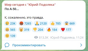 В отечественных телеграм-каналах, к слову, тоже склонны скорее верить в то, что русские самолёты оказались под ударом. Так, военный блогер Юрий Подоляка заявил, что, по его данным, информация про сбитый А-50 правдива.