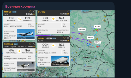 Как сообщает Telegram-канал "Военная хроника", в Жешув направились: три топливозаправщика Airbus A330-243MRTT, британский самолёт-разведчик Boeing RC-135W Rivet Joint и "авакс" Boeing E-3F Sentry ВВС Франции. Состав группы сам по себе является показательным. Самолёт ДРЛОиУ E-3 Sentry (AWACS) предназначен для дальнего радиолокационного обнаружения и управления, он фактически является воздушным командным пунктом. Британский RC-135W Rivet Joint - это разведчик, специализирующийся на радиоэлектронной разведке и перехвате коммуникаций. А три заправщика обеспечивают длительное нахождение этих самолётов в воздухе. Такая комбинация обычно указывает на подготовку к масштабной разведывательной или командной операции в регионе.