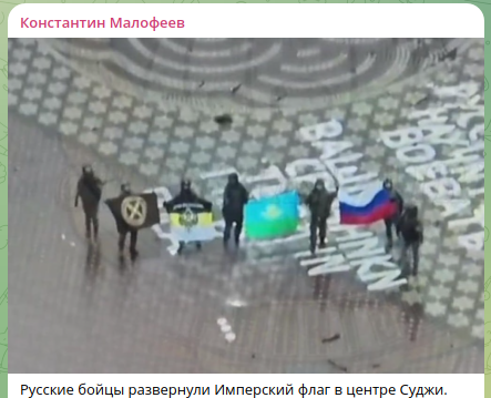 Чуть раньше повились первые кадры из центра города. Здесь русские бойцы развернули Имперский флаг.
