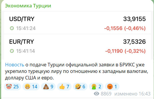 Новость о подаче Турции официальной заявки в БРИКС уже укрепила турецкую лиру по отношению к западным валютам - доллару США и евро, пишет ТГ-канал "Экономика Турции".