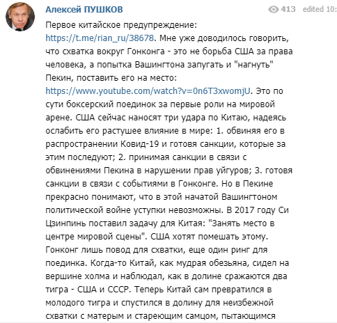 "Теперь Китай сам превратился в молодого тигра и спустился в долину для схватки с матёрым и стареющим самцом, пытающимся удержать власть над долиной. Этого столкновения долго ждали. Оно началось", - подытожил Пушков.