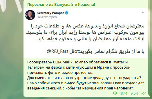 У себя на странице в соцсетях, в том числе и в Twitter, госсекретарь США Майк Помпео напрямую обратился к протестующим в Иране. В частности, он на фарси попросил присылать фото, видео и иную информацию с бунта против действующего режима.