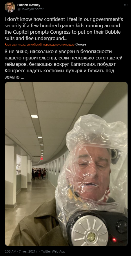 Американский журналист Патрик Хоули поделился с читателями в Twitter своим мнением о последних событиях в Вашингтоне. У него возникли серьёзные вопросы к охране правительства страны.